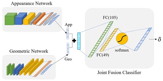 where  is the input of joint fusion classifier,  is the weight that determined by experiment, and  and  are jth softmax outputs of appearance network and geometric network, respectively. We set  as 0.54 empirically.  is (n, ) shaped vector. Originally, the softmax function makes the output probabilities from 0 to 1 and the total sum of the vector to be 1. Since  is made by weighted sum of the outputs from two networks, the total sum of  vector is over 1.