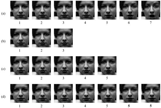 We used three types of datasets for the experiment. The Extended CohnKanade (CK+) dataset is one of most extensively used facial expression databases []. It is laboratory-controlled dataset that includes seven expressions: anger, contempt, disgust, fear, happiness, sadness, and surprise. The CK+ dataset contains 593 video sequences from 123 subjects aged 18–30 years. The image resolutions are 640 × 480 and 640 × 490. The length of sequence varies from 10 to 60 frames. Each sequence shows an expression shift from neutral expression to peak expression. Since the CK+ dataset is based on video sequence, we can extract temporal information by using this dataset.