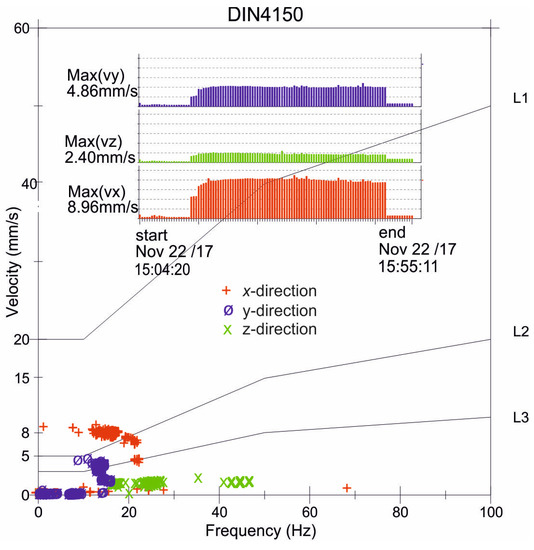 From an engineering perspective, horizontal excitation is very important, especially for some geotechnical works, such as the dynamic installation of a pipe segment using underground trenchless technology (Figure 1). Many attempts to measure the influence of underground works on existing infrastructure have been made and reported in the course of large infrastructural projects, mainly including tunnelling works [22,23,24]. The impact of dynamic guided jacking is often considered “less important”, which is why there is a lack of research on this type of excitation. However, such an excitation can cause vibration amplitudes greater than the threshold values presented in standards for vibration control [10,11,12,13,14,15]. This type of excitation and the possible damage it causes are very important, especially in cases when geotechnical works are implemented in the vicinity of existing pipelines that should soon be replaced due to their poor technical condition but must still be operated. Some selected results of vibration monitoring, carried out by the authors during a pipe installation process, are presented in Figure 2. Notably, 3D sensors were located at distances of 8 m and 12 m in the x-direction and y-direction, respectively, from the vibration source (Figure 1). The sensors were located near the ground surface. The maximum velocity component was measured in the horizontal direction (x-direction) of excitation (Figure 2). A value of close to 9 mm/s exceeds the threshold values given in the DIN4150 Standard for both vibration-sensitive structures (L3) and dwellings (L2) (Figure 2). In the presented case, the velocity amplitudes were much larger closer to the vibration source. The conclusion that can be drawn from these measurements is that vibrations caused by horizontal excitation can cause serious damage to many types of structure (Figure 2). The issue of the rational arrangement of sensors in the case of horizontally excited vibrations is of great importance but it is still not widely analysed nor described. Note that criteria for vibration monitoring during geotechnical works are more restrictive for the smaller values of the excitation frequencies (1–10 Hz), bearing in mind the natural frequencies of buildings (Figure 2). Threshold values of velocity amplitudes are established with the assumption of possible structural resonance.