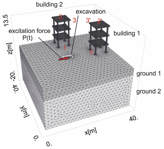 The dynamic soil parameters of a transversally isotropic, two-layered half-space are presented in Table 1 [39,40,41]. Three different cases of ground conditions are taken into account in this paper. For the first case, homogenous soil characteristics are assumed (Case 1 in Table 1). In the second case, the dynamic elastic moduli for the first layer are assumed to be greater than those for the second layer (Case 2 in Table 1). In the third case, the opposite situation is analysed (Case 3 in Table 1). Additionally, the following soil characteristics remain the same for each layer: νx = 0.301, νz = 0.182, ρ = 2000 kg/m3, and ξ = 1%. The boundary surface between the two layers is inclined in one direction (x-direction) and defined by the points P1 (0, 0, −5.5 m), P2 (40 m, 0, −3.3 m), and P3 (40 m, 40 m, −3.3 m). Different types of soil layering were examined before the final selection of three cases presented in Table 1. The idea was to investigate the worst possible case of soil layering, which results in the most significant amplification of the dynamic response being below the ground surface. During investigations, it was found that for the large differences between elastic parameters of two first layers, the effect of wave reflection from the boundary surface is more visible. Two buildings with the same three-story structure were taken into account (building 1 and building 2 in Figure 3); both were located 10 m from the vibration source P(t) in perpendicular directions from P(t) (Figure 3). The square plates in each story were 10 m wide and 0.5 m thick. Each story was 4 m high. The concrete square columns were 0.8 m wide, and the concrete square foundation footings were 3 m wide and 0.8 m thick. The dynamic parameters of the concrete elements were as follows: Gxz = 12.2 GPa, Ex = Ey = 27 GPa, νx = νy = 0.167, ρ = 2500 kg/m3, and ξ = 1% [40].