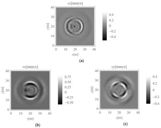 Velocity components in three directions under homogeneous ground conditions (t = 0.08 s): (a) z-direction, (b) x-direction, (c) y-direction.