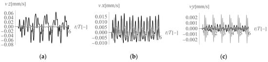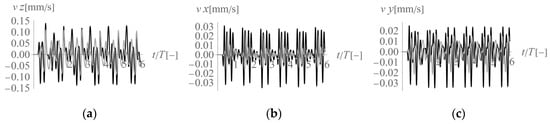 Three components of the velocity vector at Point 2 (2’) (Figure 3) under homogeneous ground conditions: (a) z-component, (b) x-component, (c) y-component; black line—building 1, grey line—building 2.