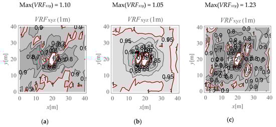 VRFxyz for the horizontal surface located at a depth of 1 m; (a) Gxz,1 = Gxz,2; (b) Gxz,1 = 10Gxz,2; (c) Gxz,2 = 10Gxz,1.