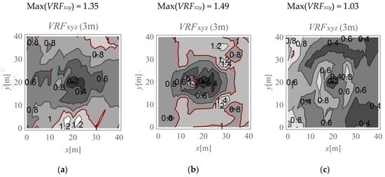 VRFxyz for the horizontal surface located at a depth of 3 m; (a) Gxz,1 = Gxz,2; (b) Gxz,1 = 10Gxz,2; (c) Gxz,2 = 10Gxz,1.