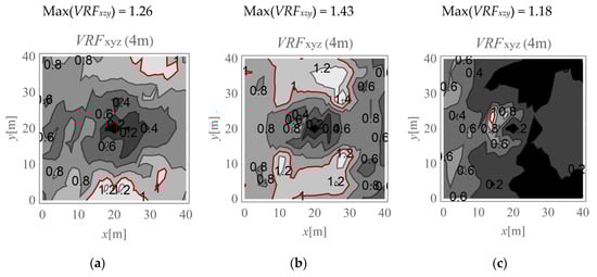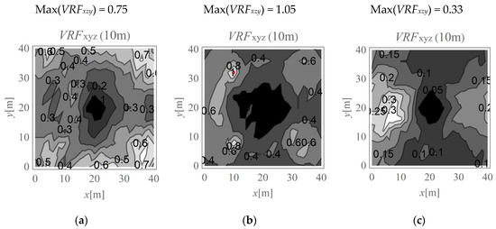 VRFxyz for the horizontal surface located at a depth of 4 m; (a) Gxz,1 = Gxz,2; (b) Gxz,1 = 10Gxz,2; (c) Gxz,2 = 10Gxz,1.