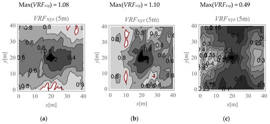 VRFxyz for the horizontal surface located at a depth of 5 m; (a) Gxz,1 = Gxz,2; (b) Gxz,1 = 10Gxz,2; (c) Gxz,2 = 10Gxz,1.
