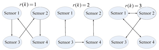 The filtering network communication topology shown in Figure 2 is represented by three directed graphs with the set of nodes , the set of edges , . Let the initial topology of the filtering network be , and the filter initial states are all set to be zeros.