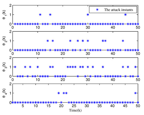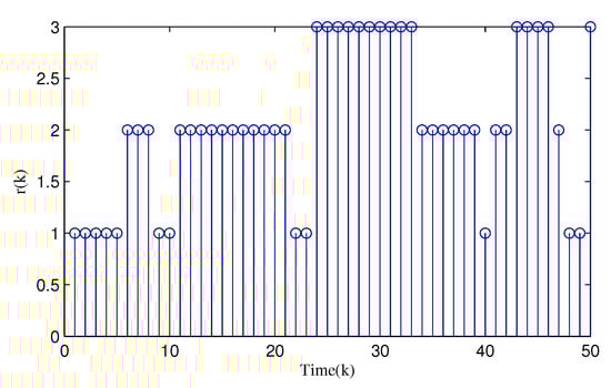 From Figure 3, Figure 4, Figure 5, Figure 6 and Figure 7, the corresponding simulation results between the full- and reduced-order filtering can be obtained. The evolution of the Markov chain is depicted in Figure 3. The attack instants of each communication channel is shown in Figure 4, where means that the local sensor node is under malicious attacks and the communication channel is injected with false information. Correspondingly, the sensor node works normally at .