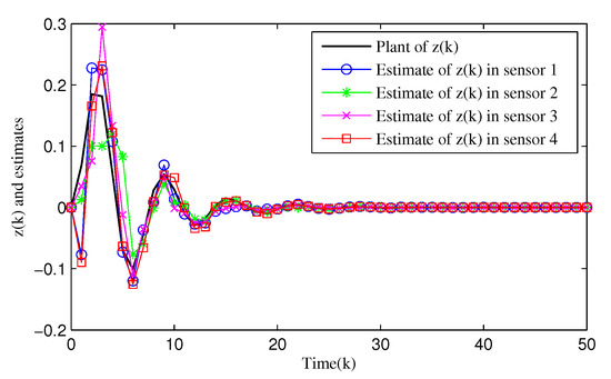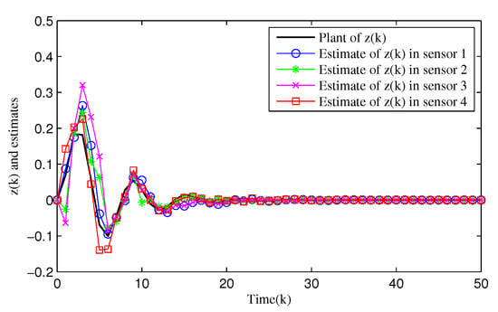 Figure 5 shows the dynamics of the filtering error norm of full- and reduced-order estimators, where , respectively. This confirms that the designed distributed full-order and distributed reduced-order filtering are both feasible and effective. Figure 6 and Figure 7 describe in detail the evolution of z(k) and its estimation from full- and reduced-filter for each sensor node 1, 2, 3 and 4, respectively. It can be easily seen that the filter estimation error is relatively large at the beginning, and then the accuracy of the estimation is gradually improved. By comparing Figure 5, Figure 6 and Figure 7, we can observe that (i) The overall estimation error of the distributed reduced-order filter slightly higher than that of the distributed full-order filter (ii) Malicious attacks do cause filter performance degradation, whether it is a full or reduced-order filter. Specifically, although the full-order filter performs better than the reduced-order filter, the distributed reduced-order filter is easier to apply to engineering.