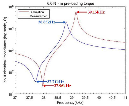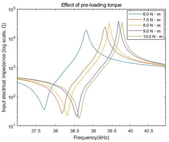 Based on the equivalent circuit model derived so far, a MATLAB simulation was carried out to calculate the electrical input impedance with a target resonance frequency at 38 kHz. To verify our analytical results, the magnitude of the input impedance was measured with an impedance analyzer (4294A, Agilent, Santa Clara, CA, USA), while the pre-loaded torque ranging from 6.0 N·m to 10.0 N·m was produced with increment of 0.5 N·m by a digital torque-wrench (WPC3-030, Bluetec, Taichung, Taiwan). Here, it was observed that the torque increment led to a nonlinear change in the strain–stress relationship of PZT-4 and, in turn, the Young’s modulus. The tangential slope of the strain–stress curve varied from 5.16 to 5.99 × 1010 N/m2, depending on the applied torque. Sound speed in materials—one of our model parameters—explicitly influences other parameters such as terminal and cross-impedances in the Mason model and T-circuits. Note that the square of the sound speed is proportional to the modulus. Under the saturation of Young’s modulus toward stronger torque, the sound speed in PZT-4 was, thus, adjusted from 2591 m/s to 2791 m/s and linearly increased by 25 m/s for the sake of simplicity. Each torque–resonance test was repeated twice to provide statistical measurements. The number of test rounds was carefully chosen, since the excessive repetition of a compression–release procedure leads to metal fatigue, which adversely affects the mechanical integrity of the transducer. A one-hour aging period after bolt clamping is necessary to make sure that the torque fully settles throughout the transducer.