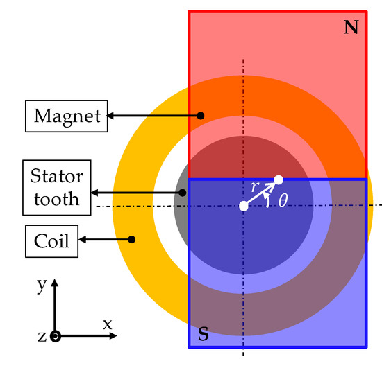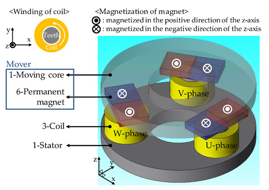 Figure 3 shows that the magnet placed on the U-phase is translated in a direction. The magnets of V-phase and W-phase placed by 120/240° are translated in the same direction as U-phase. While the mover is translated by the distance r in θ direction, the detent force can be defined as follows: