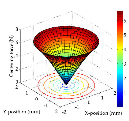 where δ is the coefficient of slope that represents the relationship between the moving distance of the mover and the force acting on the mover, Fdx is the force in the X-direction, Fdy is the force in the Y-direction, and Fdθ is the force in the θ-direction. Equation (3) indicates that the mover always receives centering force in the origin direction wherever it is positioned. This characteristic is similar to the case that several mechanical springs are mounted radially on the X–Y plane. Figure 4 indicates the centering force of 2-DOF LRA obtained by FEA results. As a finite element analysis tool, 3D model transient analysis of JMAG software was used.