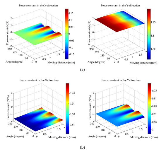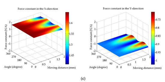 Figure 5 shows the X and Y components of the force generated by the coil current 1A of each phase in the reference frame. Figure 5a indicates the result of the force constant on the U-phase. As the moving distance r increases, it shows non-linear characteristics because the magnet deviates from the tooth. Overall, it can be seen that only the force in the Y-direction is generated. Meanwhile, Figure 5b denotes the result of the force constant on V-phase. Since the V-phase is located at a position rotated 120° from the U-phase, a force constant is generated in a direction rotated 120° from the Y-direction. In the case of Figure 5c, a force constant on W-phase is generated in a direction rotated 240° from the Y-direction.