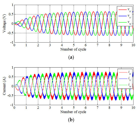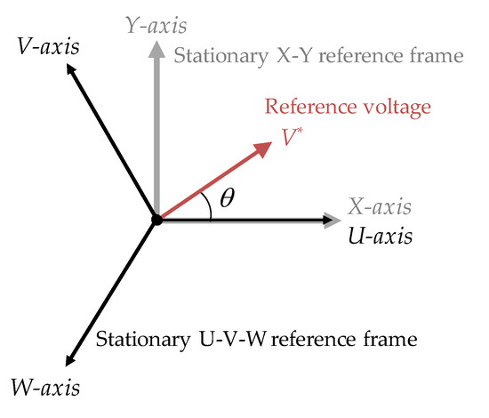 The vector direction of the force generated by voltage reference in the space vector is rotated by −90°. Figure 8 illustrates the reference voltage in the reference frame. In order to generate voltage in the target direction, voltage must be expressed in the U–V–W reference frame. Therefore, the voltage reference can be transformed in the reference frame as follows: