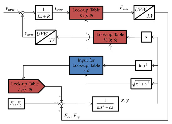 Figure 9 illustrates the block diagram of 2-DOF LRA. As shown in Figure 9, force constant, back-EMF constant, and detent force are used as the look-up table with FEA results. Inputs of each look-up table are obtained by converting position information (x, y), which is the output of the model to moving distance (r) and angle (θ).