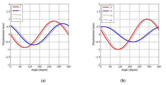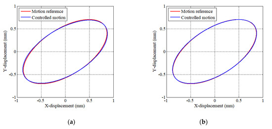 In Section 4, we have mentioned the estimation method of target angle error Δθ. Figure 13a presents the result of elliptical motion without Δθ compensation. On the other hand, Figure 13b shows the case which compensates the estimated Δθ. As a result, precise motion can be realized by compensating the estimated Δθ.