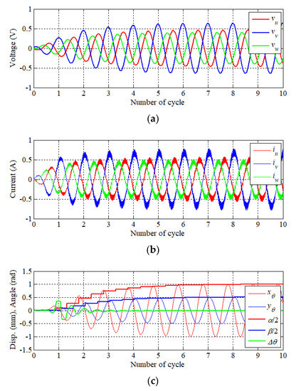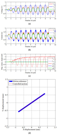 Simulation results of reciprocating motion with a resonant operation are shown in Figure 14. Reference stroke and angle were inputted into the controller as α 2 mm, β 0 mm, and θ 35°. Figure 14a indicates three-phase voltage which represents the fundamental waveform of the PWM. In Figure 14b, three-phase current waveform is illustrated. Each phase current contains some ripple component due to SVPWM. The reciprocating motion can be realized by two-phase currents with the same phase and one phase current with the phase difference of 180°. The amplitude and phase of each phase current are determined by the stroke and direction of the reciprocating motion. Figure 14c indicates the result of displacement (xθ, yθ), stroke (α, β), and angle error (Δθ). It was confirmed that the displacement and stroke in the rotating frame converge into α within a period of six cycles, while β keeps being 0. Figure 14d presents the trajectory of the displacement on the X–Y plane. As a result, the precise resonance operation can be obtained as the reciprocating trajectory with an angle.