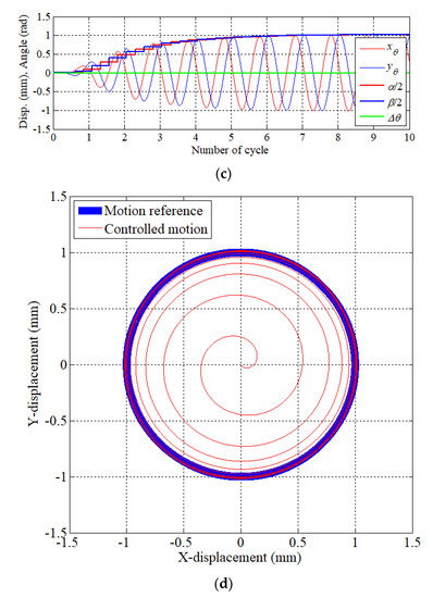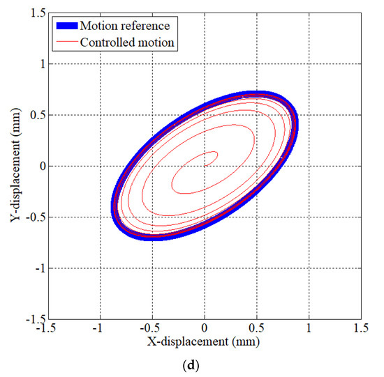 Figure 15 illustrates simulation results of elliptical motion. Reference stroke and angle were inputted into the controller as α 2 mm, β 1 mm, and θ 35°. In the case of three-phase permanent magnet synchronous motor (PMSM), each phase current has the same magnitude at a constant load and has a phase difference of 120°. However, it can be seen that the amplitude and phase difference of each phase are changed for the resonance operation of the elliptical motion. A displacement and amplitude at the rotating frame is shown in Figure 15c. It was confirmed that the target motion converges within a period of six cycles from the initial position. The trajectory of the displacement on the X–Y plane is shown in Figure 15d. As a result, it can be seen that resonance operation can be performed as the elliptical trajectory.