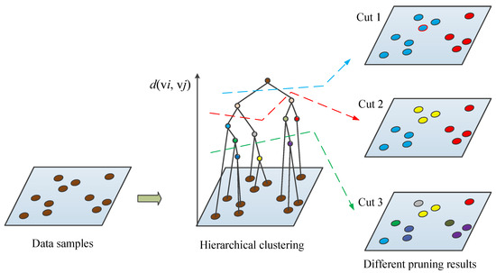 where represents any data sample of two clusters before merging, and is a pair of clusters, is the central data point of the new cluster, and is the Euclidean distance between each sample to . In this way, the clusters with high similarity in measured characteristics are merged, and the complete hierarchical structure can be obtained by repeating the union process.