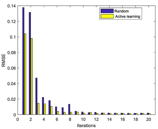 Root-mean-square error (RMSE) values of penicillin concentration under AL and RS sampling strategies during iteration.