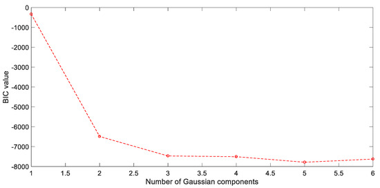 In this case, GMM is used to divide the updated process dataset into three subsets. Subsequently, the BIC criterion is applied for structure optimization to avoid the model over-fitting and contribute to data interpretation ability enhancement. The BIC value decreases gradually while Gaussian component number increases, as shown in Figure 10. However, further increases of value do not cause further decreases of the BIC value. Combined with the prior knowledge of PFP, which consists of three physiological stages, one can be judged that the most optimal component assignment should set as 3.