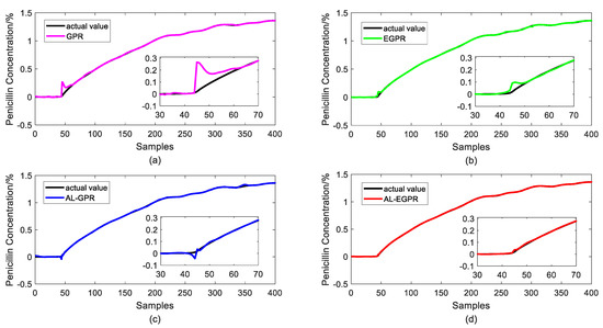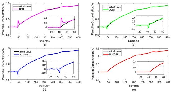 Figure 11 and Figure 12 illustrate the prediction results of test samples by these four soft sensors after the 3rd iteration and the 7th iteration, respectively, to show the prediction performance more intuitively. In Figure 11, the GPR predictor presents the worst prediction performance on account of its RS strategy and global model structure. By contrast, EGPR and AL-EGPR, on the basic of ensemble model structure, further enhance the generalization capability by partitioning the training data into isolated regions for local modelling. The two ensemble model based soft sensing strategies are both able to track the main trend of the penicillin concentration. In comparison, the proposed AL-EGPR soft sensing model as well as AL-GPR model performs much better than GPR and EGPR do, as its prediction output results are closer to the real values. The similar conclusion can be drawn from the prediction results in Figure 12. Generally, the modelling space is enlarged, and it contributes to developing a satisfactory soft sensor with high prediction accuracy. In addition, the dataset partition based ensemble learning is particularly effective to handle the multiphase processes with high complexity, and thus further enhances estimation behavior of regression model.