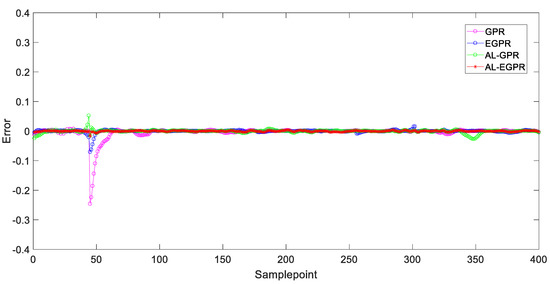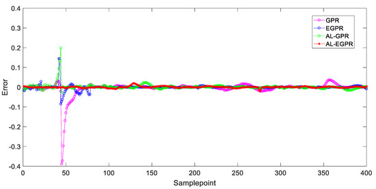 The estimation error results of four different manners after the 3rd and the 7th iterations are given in Figure 13 and Figure 14, respectively, to reveal the effectiveness of the proposed soft sensor further. The closer the error curve is to the zero line, the more accurate the prediction is. By comparing these four prediction error results, we can readily conclude that the global GPR model that is based on RS strategy performs worst among the four soft sensing models and the proposed soft sensor modelling under ensemble learning framework further provides a more accurate prediction on the basis of AL-GPR with active learning strategy.