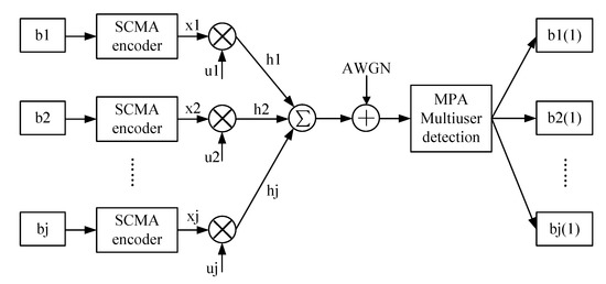 The SCMA uplink model consists of transmitter, transmission channel and receiver, as shown in Figure 1. Assuming that the number of sensor nodes is j and the number of time-frequency resource blocks is K (J>K), the binary bit data stream bj (b1, b2, …, bJ) is obtained after the sensor node information uj (u1, u2, …, uJ) is encoded by the source and the channel. Then data enters the SCMA encoder, which maps it to the sparse SCMA codebook x=f(bj); the mapping process of SCMA [37,38] can be defined as . B is the set of binary numbers, is the sensor node’s codebook, and M is the size of the codebook. Due to the channels of each layer of the upper link being different, the channel factor is different, here assuming that the channel factor is hj (h1, h2, …, hJ).