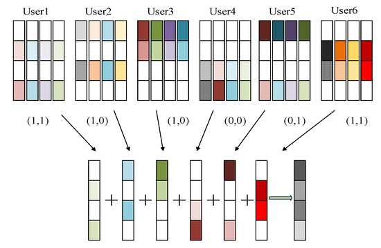 If six sensor nodes occupy four time-frequency resource blocks, the overload ratio is 150%. As shown in Figure 2, the bit information of six sensor nodes is mapped to the codewords of different codebooks [39], and each sensor node has a unique codebook. Each codebook contains two non-zero elements and two zero elements, so the codebook length is 4. In the factor graph, 1 represents the non-zero element and 0 represents the zero element, then the user information can be expressed by a matrix as in Equation (3):