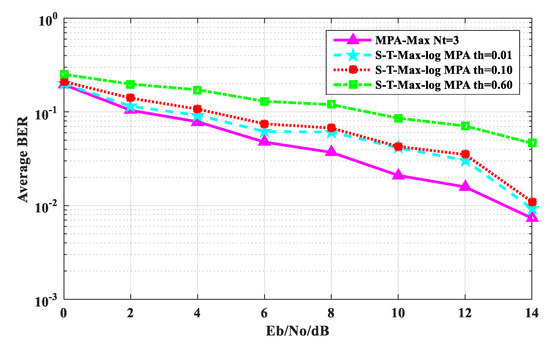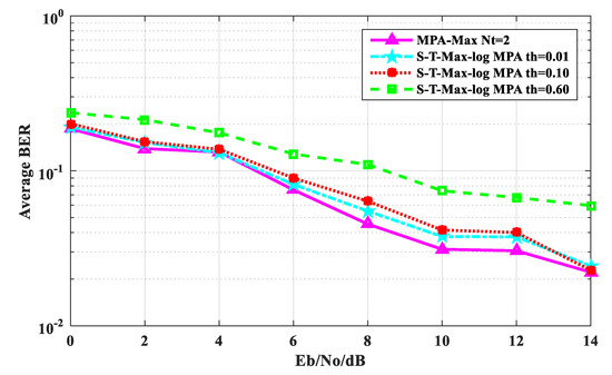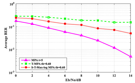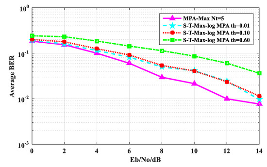 Figure 6 shows the comparison of the average BER performance among the S-T-Max-log-MPA algorithm experiments: the original MPA algorithm and the T-MPA algorithm, in which the maximum number of iterations tmax = 5 and the threshold is th = 0.60. It can be seen from Figure 6 that the BER performance of the S-T-Max-log-MPA algorithm is lower than that of the T-MPA algorithm, which is 4.26% lower than that of the T-MPA algorithm when Eb/No = 0 dB. When Eb/No = 14 dB, it is 10.397% lower than the T-MPA algorithm. The BER performance of the S-T-Max-log-MPA algorithm is higher than that of the original MPA algorithm, which is 6.47% higher than that of the original MPA algorithm at Eb/No = 0 dB. At Eb/No = 14 dB, it is 4.4997% lower than the original MPA algorithm. According to the comparison results, we can see that although the BER performance of the S-T-Max-log-MPA algorithm is higher than that of the original MPA algorithm, it is lower than that of T-MPA algorithm.