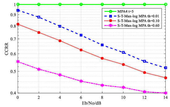 Figure 7 shows the comparison of the computational complexity reduction ratio (CCRR) between the S-T-Max-log-MPA algorithm and the original MPA algorithm when the maximum number of iterations is 5; the complexity reduction ratio of the algorithm is defined as Equation (17). As can be seen from Figure 7, at the threshold of th = 0.01, when Eb/No = 0 dB, the CCRR of the S-T-Max-log-MPA algorithm is 5.74%, which is lower than that of the original MPA algorithm. When Eb/No = 14 dB, the CCRR is 48.18% lower than the original MPA algorithm. At the threshold of th = 0.10, when Eb/No = 0 dB, the CCRR of the S-T-Max-log-MPA algorithm is 18.42% lower than that of the original MPA algorithm. When Eb/No = 14 dB, CCRR is 53.20% lower than the original MPA algorithm. When the threshold is th = 0.60, CCRR is more effective than the threshold values of th = 0.01 and th = 0.10. At Eb/No = 0 dB, CCRR is 44.71% lower than the original MPA algorithm. At Eb/No = 14 dB, CCRR is 60.10% lower than the original MPA algorithm. It can be seen from the figure that the CCRR of the S-T-Max-log-MPA algorithm under different thresholds is lower than the CCRR of the original MPA algorithm, so the S-T-Max-log-MPA algorithm can effectively reduce the CCRR of the SCMA system detection algorithm, and the effect is more obvious with the increase of Eb/No and the threshold.