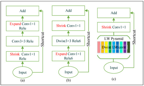 The deep bottleneck architecture of ResNet is introduced in Reference [20,43]. Figure 2a shows the structure of ResNet bottleneck. It substantially increases the feature map number, while decreasing the number of weights and the computational cost. Layer dimensionality impacts the manifold of interest in neural networks. In ResNet, the number of channels experiences a series of changes. Firstly, the network has high-dimensional inputs. Afterward, the number of channels significantly shrinks in the first pointwise convolution operation, then stays the same in the following standard convolution layer, and finally expands back to the input size in the next pointwise convolution. This structural design effectively reduces the computational cost of standard convolution. Figure 2b shows the basic structure of MobileNetV2 invert residual bottleneck. On the contrary, the invert residual bottleneck has low-dimensional inputs, and the number of channels firstly expands then shrinks. The depthwise convolution is much lighter than standard convolution, making the thicker convolution possible, and this structure proved to be more efficient in running memory and slightly increased the model accuracy.