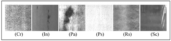 NEU surface defect dataset [1] is a hot-rolled steel strip surface defect dataset including 6 classes (1800 images) of defects. Images are grayscale with uniform size . The steel defects include crazing (Cr), inclusion (In), patches (Pa), pitted surface (PS), rolled-in scale (RS), and scratches (SC), as shown in Figure 5. Images are captured in different exposure conditions, their intra-class defects exist large differences in appearance while the inter-class defects share some similar aspects, making the classification task challenging.