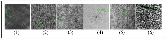 The DAGM dataset, the green ellipses are the provided coarse ground truths. (1)–(6) are the 6 classes of the surface in the dataset.
