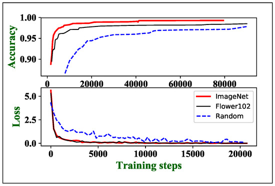Fine-tune can also accelerate convergence. As shown in Figure 8, the Cross-Entropy losses of pretrained models decrease much faster than the random initialization ones. The ImageNet pretrained MobileNetV2@1.4 obtains the highest validation accuracy (99.93%) with only 4000 training steps, which is 22.5 times faster than the random initialization. Our experiment also shows that transferring the features of the larger scale source dataset is more generalization. As shown in Figure 8, ImageNet pretrained model has higher validation accuracy than Flower102 pretrained model at the same training loss. The ImageNet pretrained model has also higher accuracy improvement as seen in Table 3. However, it takes days to weeks to pretrain a designed model on ImageNet with a high-performance computer equipped with exceptionally strong GPUs and over 130 GB disk storage. Since the accuracy improvement of Flower102 pretraining is competitive to ImageNet pretraining, a much smaller source dataset can be used as a compromise when computing resources are limited.