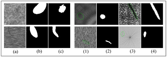 Results of DAGM dataset. (a): At the early training steps, training images are zoomed to the defect, (b) are the label of (a), (c) are the predicted images of the model. (1), (3) are the full-scale image, (2), (4) are the prediction of the well-trained model, predict masks are more accurate than the ground truths sometimes.