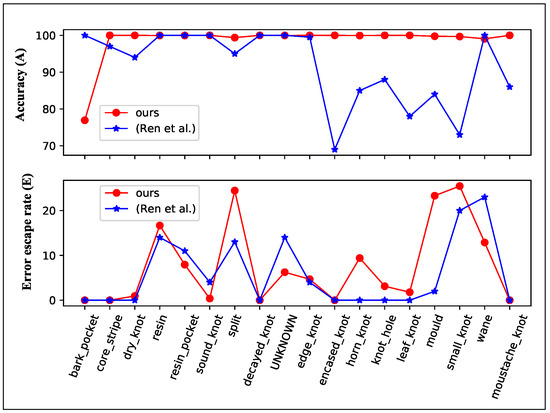 Wood defect dataset [5] is a surface defect dataset of dried lumber boards, containing 18 types of defects (839 images with size ). Figure 7 shows defects and the corresponding ground truths with a set of bounding boxes. Some defects only appear in 2 or 3 images, such a severe imbalance of image distribution brings many difficulties to our work.