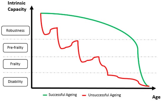 Graphical representation of simulated successful and unsuccessful aging trajectories. The horizontal axis represents the advance of time from the beginning of the old age to the end of life. The vertical axis represents the categories in which patients fall along the progress of functional decline (from robustness to disability). The green line represents a successful aging trajectory: good functional status is enjoyed for most of the old age and functional decline only happens rapidly and close to the end of life. The red line represents an unsuccessful aging trajectory: a clear trend of fast functional decline is observed throughout old age together with a long period of disability, several years long, before the end of life.