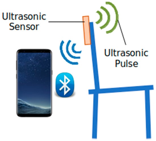 Depiction of the experimental set-up. The chair–stand sensor was attached to the backrest of a regular rigid chair. The chair–stand sensor emitted ultrasonic pulses toward the subject’s back. An Android app in a mobile device was used to control the chair–stand sensor via Bluetooth and to store the sensor readings for subsequent analysis.
