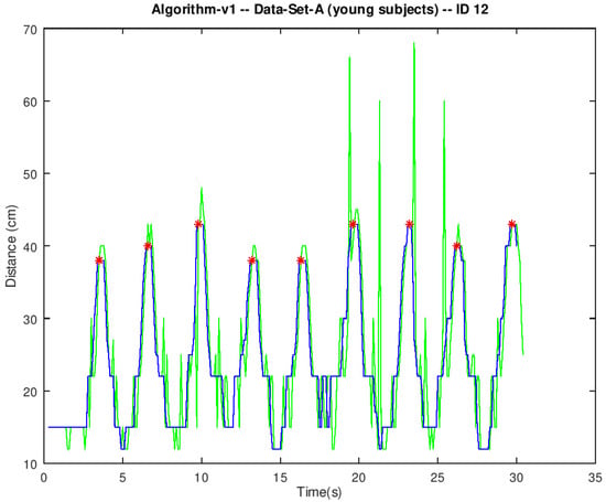 In the preliminary algorithm, hereon Algorithm-v1, the preprocessing stage was used to detect and reset outliers. All sample values over 70 cm (which is way over the maximum expected distance for an upright position) were set to 15 cm (an estimation of the usual distance for a sitting position). A moving median filter (window length of 0.7 s) was applied to the preprocessed signal. Local maxima in the filtered signal were considered to be a single peak if they were separated by less than a given threshold known as the peak distance threshold (PDT). The resulting peaks were considered to be successful sit-to-stand transitions if they exceeded another given threshold known as the peak height threshold (PHT). The PDT was computed as the median distance between peaks in the filtered signal multiplied by a given factor known as the distance factor (DF). Ten signals from dataset A (healthy subjects) were used to adjust the value of DF and PHT by minimizing the mean error between the outcomes of the algorithms and manual counts.