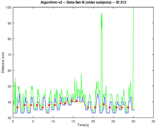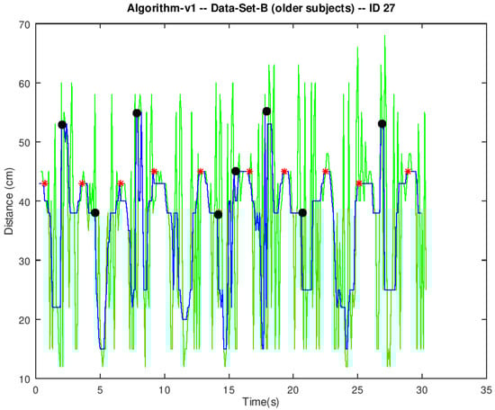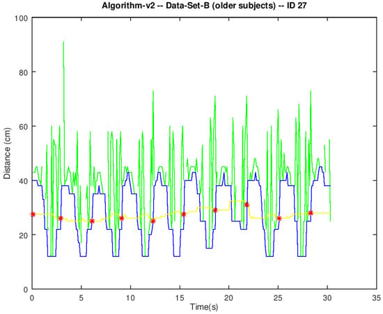 In the second algorithm, hereon Algorithm-v2, the threshold value for outlier detection in the preprocessing stage was increased from 70 to 99 cm. All sample values over 99 cm were set to NaN (Octave’s label for non-defined values). A moving minimum filter (window length 0.7 s) was applied to the preprocessed signal. An adaptable threshold known as the sitting–standing threshold (SST) was applied to the filtered signal to obtain a binary signal with two possible states, i.e., if the subject is sitting or standing. The time points when the subject stood up were detected by spotting changes in the sign of the binary signal’s derivative. All standing events closer to each other than a given threshold known as the minimum peak distance (MPD) were merged together into a peak. The MPD was measured in seconds. The resulting peaks were considered eligible candidates for sit-to-stand transitions and were further processed to merge peaks closer to each other than a given threshold known as the minimum samples between peaks (MSBP) and to discard peaks smaller than another given threshold known as the minimum subject distance (MSD). The MSBP was measured as the number of samples and the MSD was measured in cm. The adaptive threshold SST was defined as the sum of the moving minimum plus the weighed subtraction of the moving minimum from the moving median of the preprocessed signal (using a 4-s window for both moving filters). The weight is known as the adaptive threshold weight (ATW). Ten signals form dataset B (older subjects) were used to adjust the values of the ATW, the MPD, the MSBP, and the MSD.