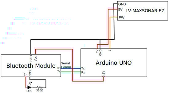 Schematic diagram of the chair–stand sensor. An Arduino UNO board was in control of the ultrasound sensor and collected its distance readings. It made use of the Bluetooth module to exchange messages with the external mobile device. The Arduino UNO board was powered by six AA batteries and was used to power the other two modules. The batteries are omitted in this scheme for the sake of clarity.