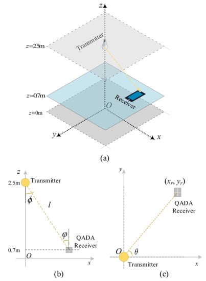 . This is different from the coordinate system used within the QADA front-end so that the effect of different receiver orientations can be studied. In this section, a single transmitter with fixed optical power is considered. It is placed directly above the origin,