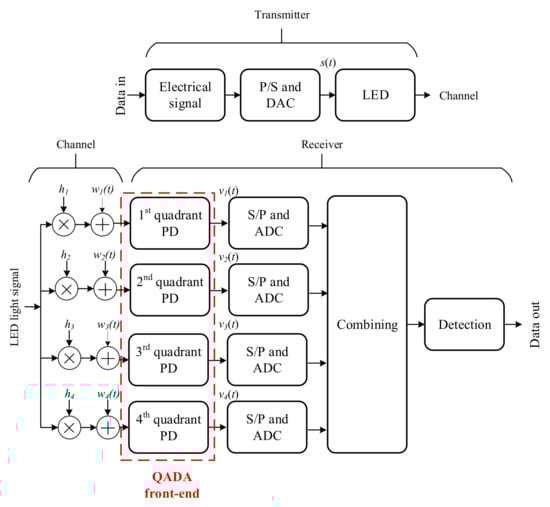 Figure 6. An electrical signal that carries the data is generated at the transmitter, which is then used to modulate the intensity of the LED. At the receiver, the optical signal is converted back to an electrical signal by the quadrant PD. At the output of the optical front-end, four signals are generated, each corresponding to one of the quadrants. After the analog-to-digital converter (ADC), the received signal from each quadrant