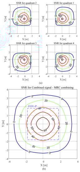 Figure 7b shows the SNR contour plots when the quadrant with the maximum power is selected. Now, as long as the luminaire is within the FOV-C of the receiver, the SNR is high in most locations.