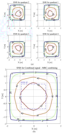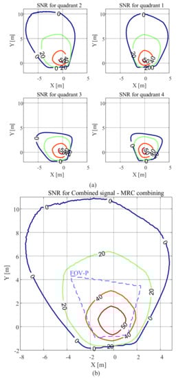 Figure 7a. For each quadrant, the SNR is relatively high in some locations. For example, for the fourth quadrant, the SNR is more than 20 dB, for values of
