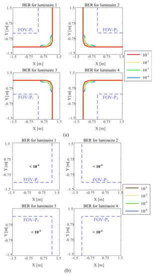 , as long as the luminaires are within the FOV-C of the receiver, the signals are received with a very low BER. However, because of the smaller FOV-C, in some locations within the room, the receiver is unable to capture the signals from some luminaires. For both values of FOV-C, we can see that the FOV-P for each luminaire is within the low BER area. So, we can conclude that the communication characteristics of a QADA are not going to be a limiting factor when the receiver is used for VLP applications.