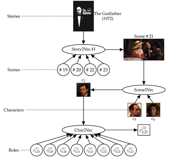 We employ this approach and redefine the adjacency and appearance according to narrative utterances on upper and lower layers. From the social role to the character, we focus on that characters have typical roles in a story, and the roles change with the development of the story [20]. A character is represented based on (i) dynamic changes in the social roles of the character and (ii) social roles rooted in character. For the scene, we concentrate on that a scene describes a concluded event. Thus, appearances of characters and relationships among the characters have to be designed to present the event [20,21]. A scene is represented by (i) the existence of relationships between characters in the scene and (ii) characters that appear in the scene. Finally, a story is a series of events, and a scene describes a concluded event [20,21]. The composition and order of scenes in a story can reflect the content and storytelling methods of the story, respectively. Therefore, a story is represented based on (i) temporal adjacency between scenes in the story and (ii) scenes composing the story. The three layers are called as ‘Char2Vec’ (Section 3.1), ‘Scene2Vec’ (Section 3.2), and ‘Hierarchical Story2Vec (Story2Vec-H)’ (Section 3.3), respectively, and this embedding model is called as ‘Hierarchical Story Embedding (HSE).’