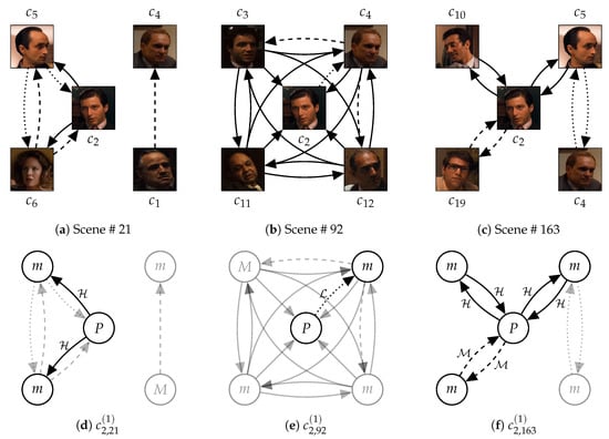 Figure 3. Examples of relationships between social roles, characters, scenes, and stories. (ac) represent the social relationships between characters on Scene # 21, # 92, and # 163 in ‘The Godfather’ (1972), respectively. Then, (df) describe social roles of ‘Michael Corleone’ ( c 2 ) at degree d = 1 on Scene # 21, # 92, and # 163, respectively. From (d) to (f), we can see the meanings of time-sequential changes in social roles. (e) shows the significance of adjacent degrees of social roles. (ac) show the way how relationships of characters are designed to convey the content of the scenes. Finally, also based on (ac), we can find out the meaning of the order of scenes.