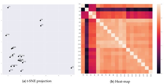 Figure 4. Vector representations of characters in ‘The Godfather’ (1972) that were generated by Char2Vec. Dots on (a) denote 19 characters that appeared in ‘The Godfather’ (1972), excluding extras. Since the vector representations (which are 32-dimensional) have been projected into 2-dimensions using t-SNE, the axes of (a) are not significant. (b) presents a heat-map for similarity between the character vectors. The similarity was calculated by Equation (16).